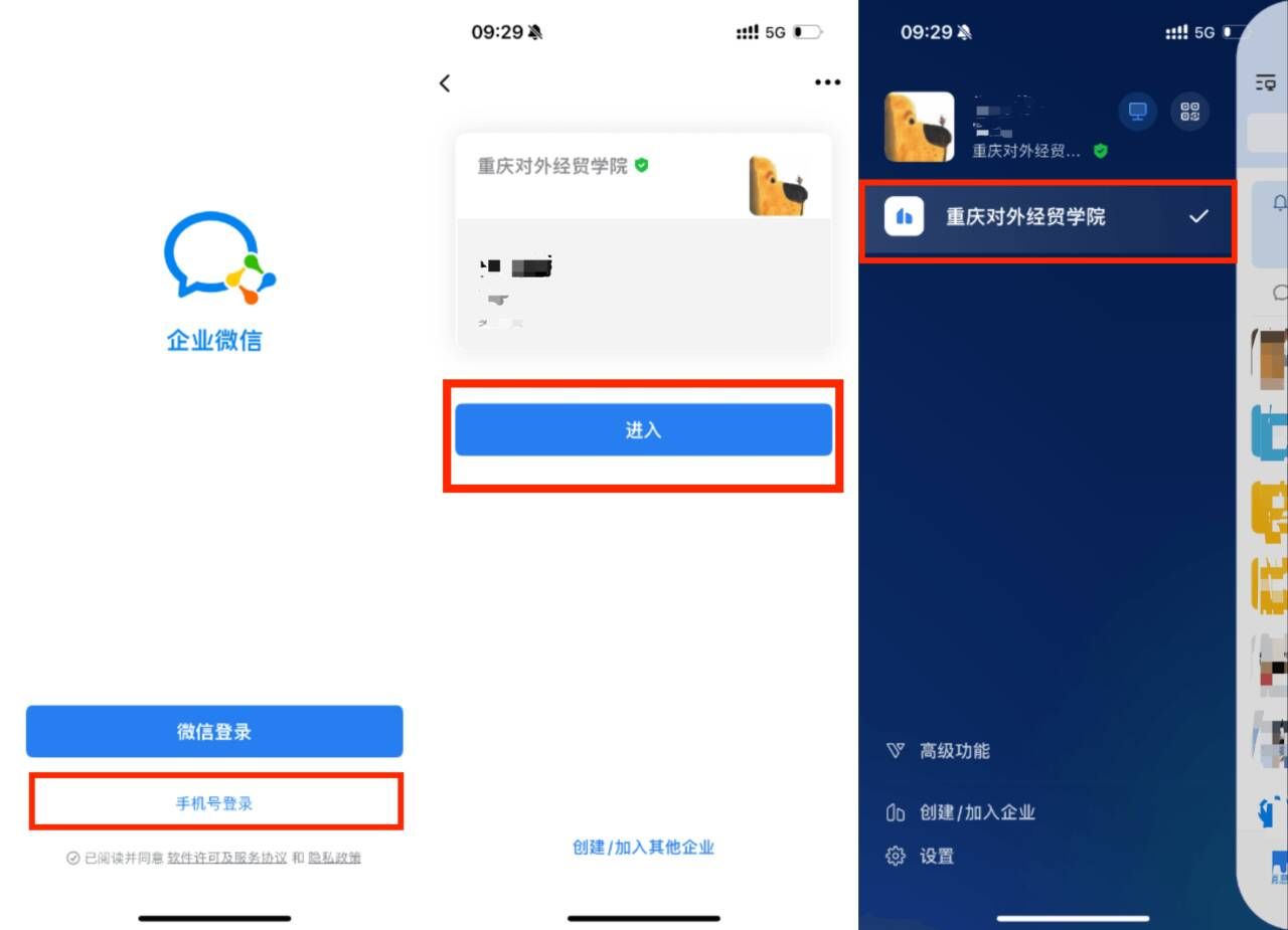 A:其他企业与重庆对外经贸学院企业所在的企业微信账号绑定的手机号不一致所导致,将两个企业微信账号换绑成一致的手机号后,再用手机号登录企业微信。