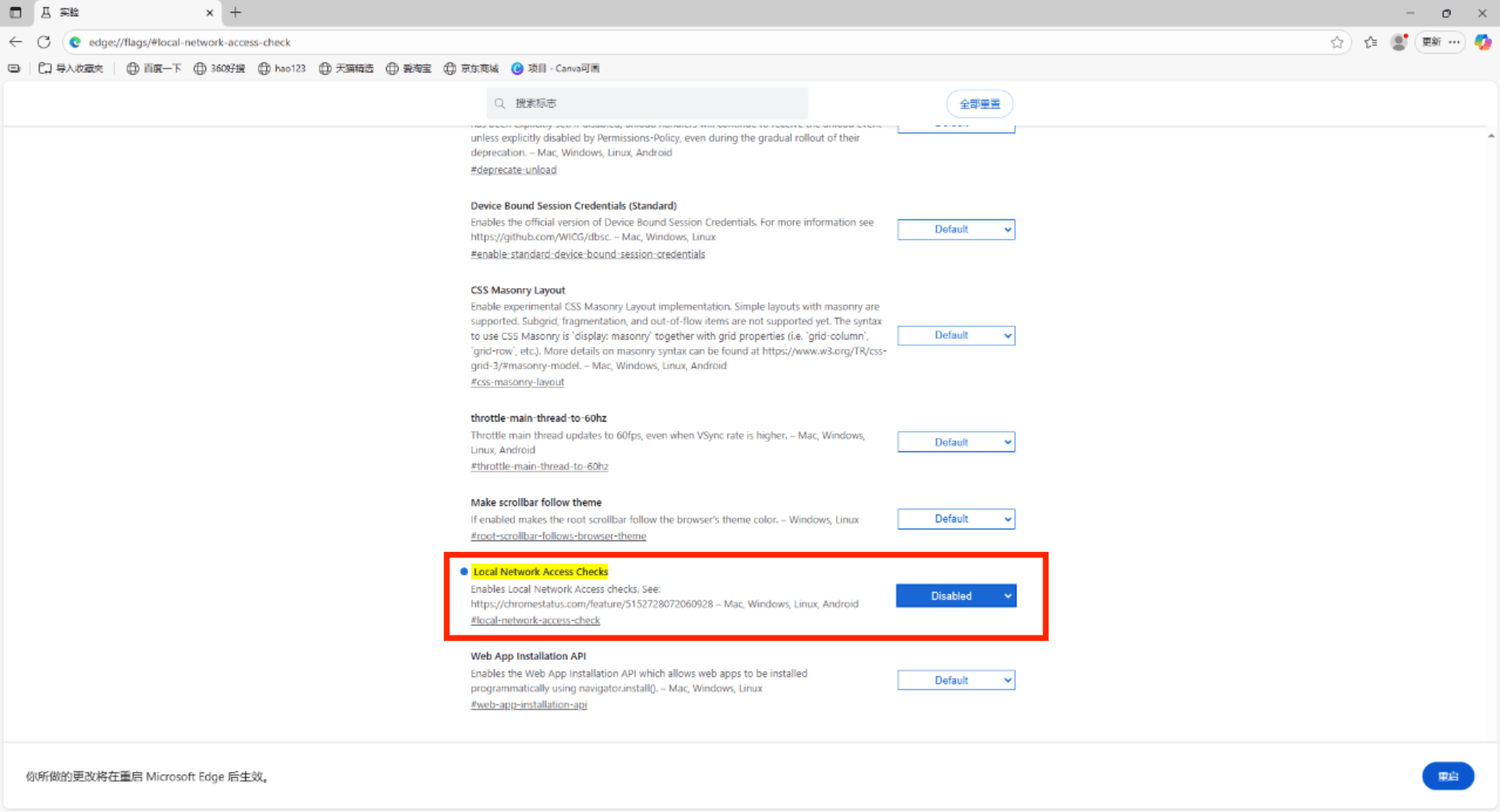 1. 在地址栏输入:edge://flags/#local-network-access-check
